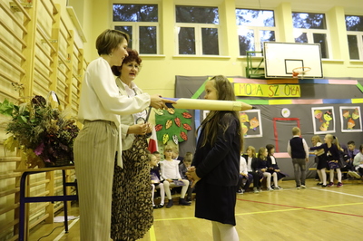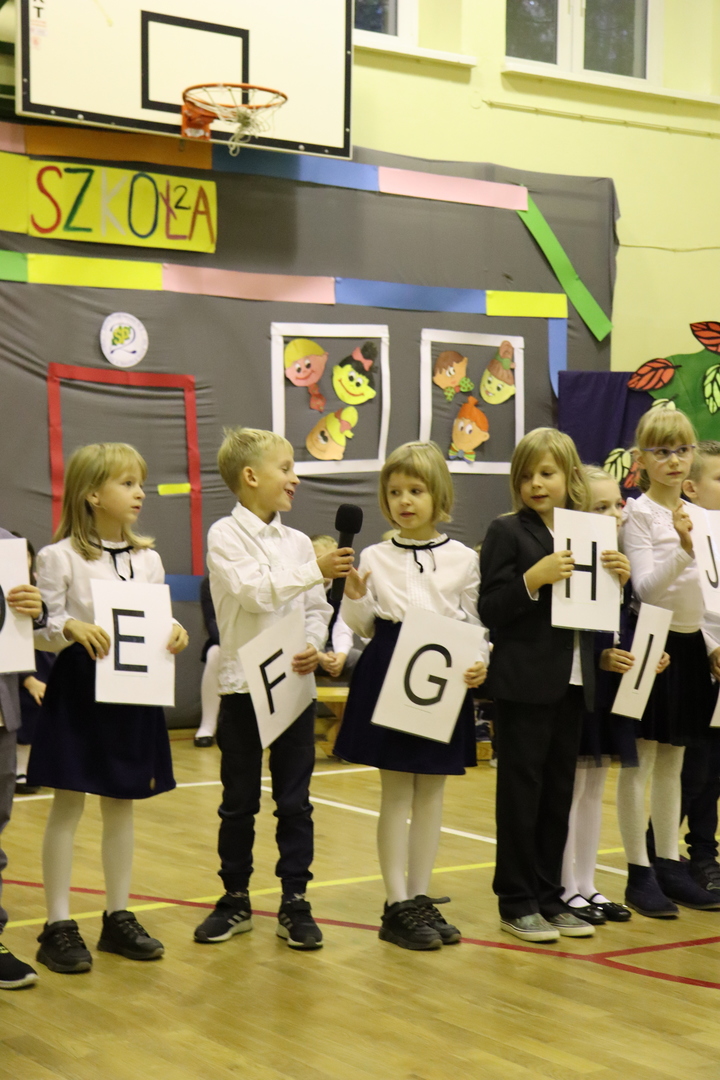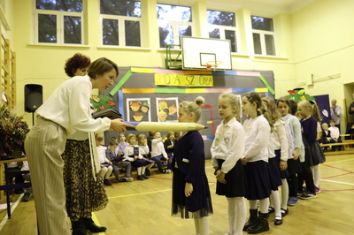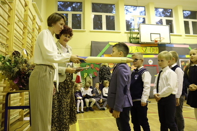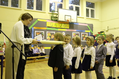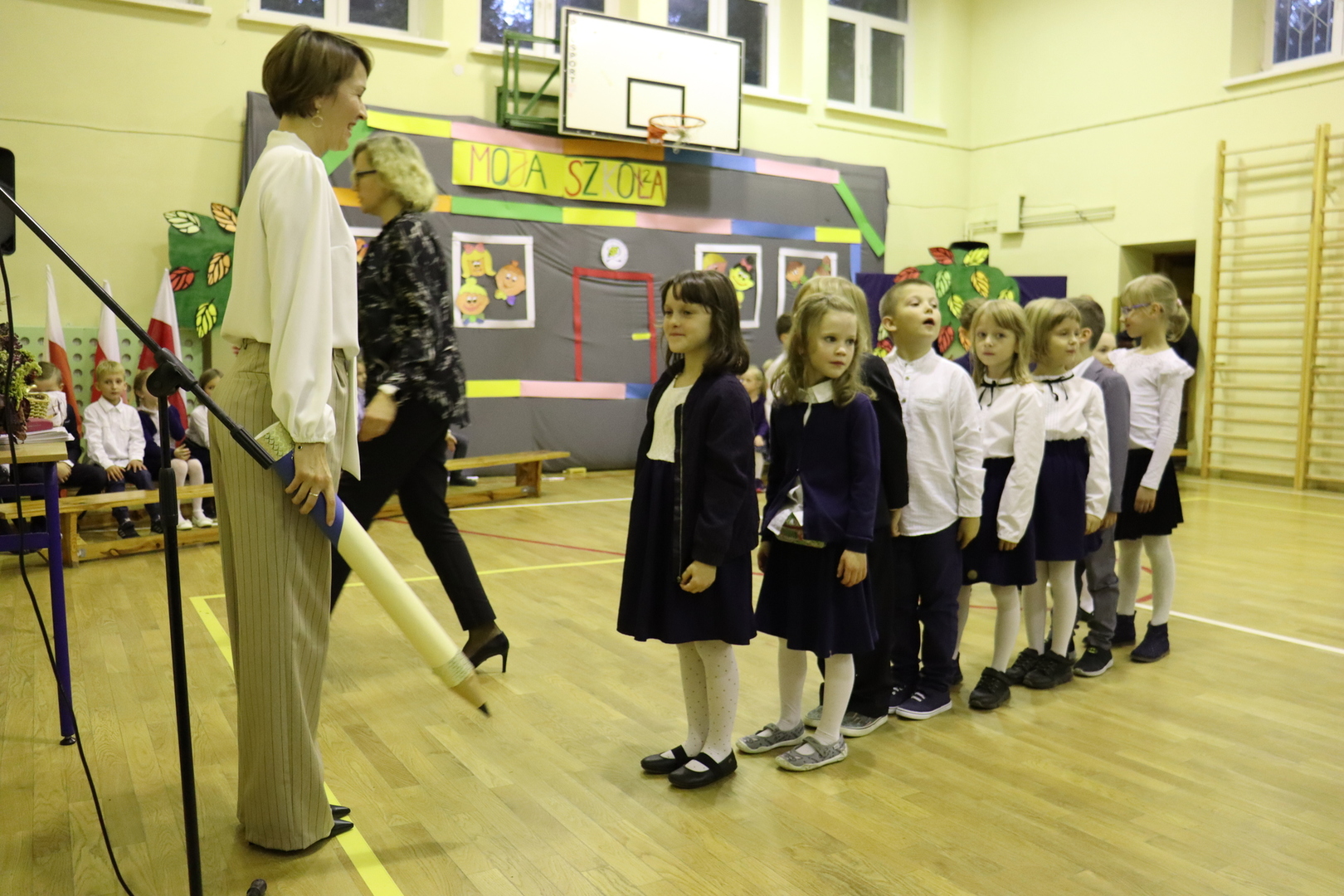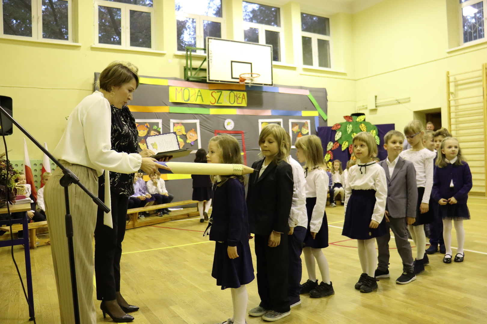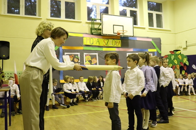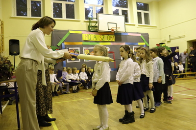 Po złożeniu ślubowania przez dzieci pani dyrektor Beata Woźniak dokonała symbolicznego pasowania na ucznia dotykając ołówkiem, jak czarodziejską różdżką, ramion pierwszoklasistów. Zanim jednak maluchy zostały przyjęte do grona społeczności szkolnej, musiały przedstawić to, czego już się w szkole nauczyły. Gotowi, odświętnie ubrani i bardzo przejęci, przystąpili do zaprezentowania swoich umiejętności: wokalnych, recytatorskich i tanecznych. Wszyscy zebrani goście nagrodzili małych artystów gromkimi brawami. Tego dnia uczniowie otrzymali również pamiątkowe dyplomy, tarcze naszej szkoły oraz pierwsze legitymacje. Następnie przyszedł czas na pamiątkowe zdjęcia z przybyłymi na uroczystość gośćmi, na życzenia, podziękowania, uściski.