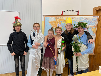 Zadaniem uczniów było przebrać się za greckiego boga. Każdy przygotował też krótką prezentację w formie zagadki. Niektóre były naprawdę trudne. Był również poczęstunek na miarę bogów.
