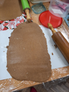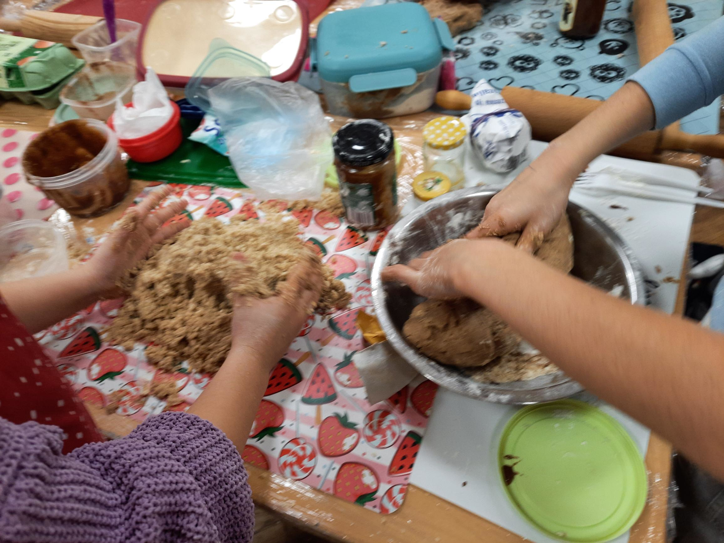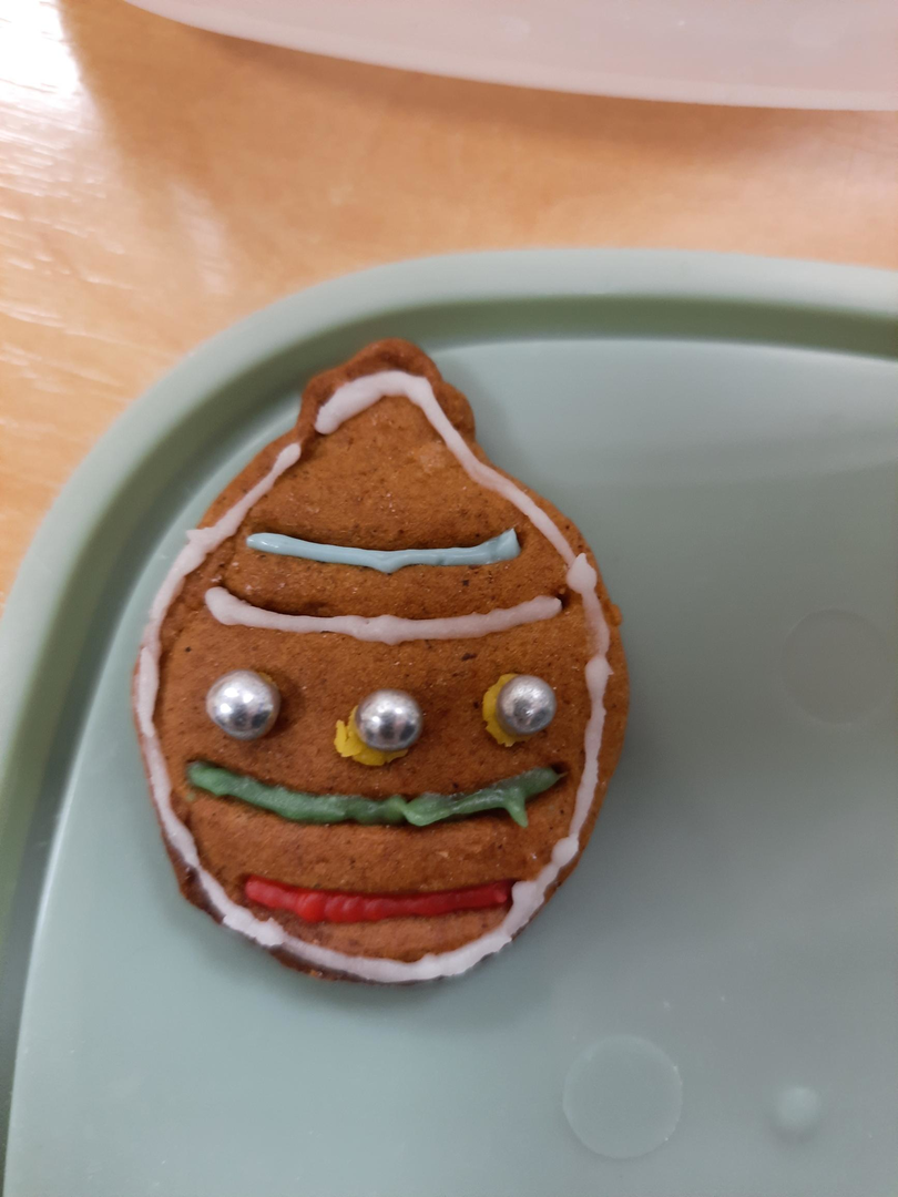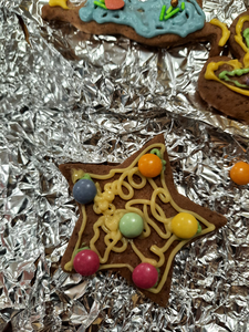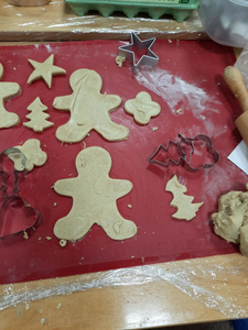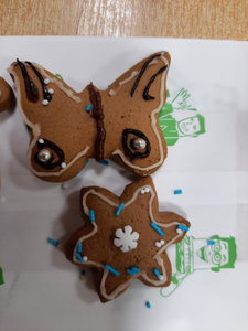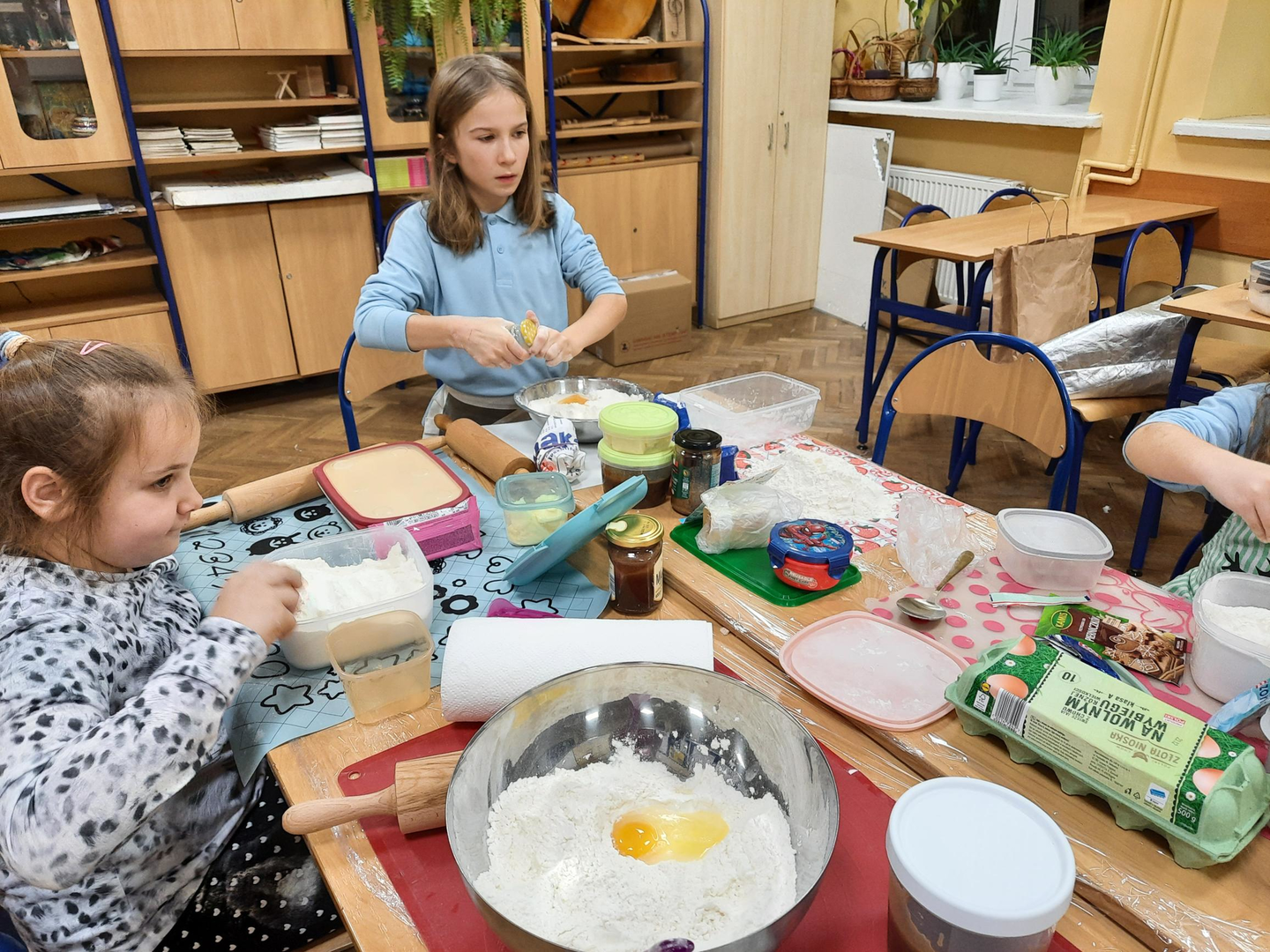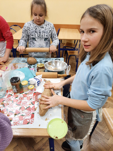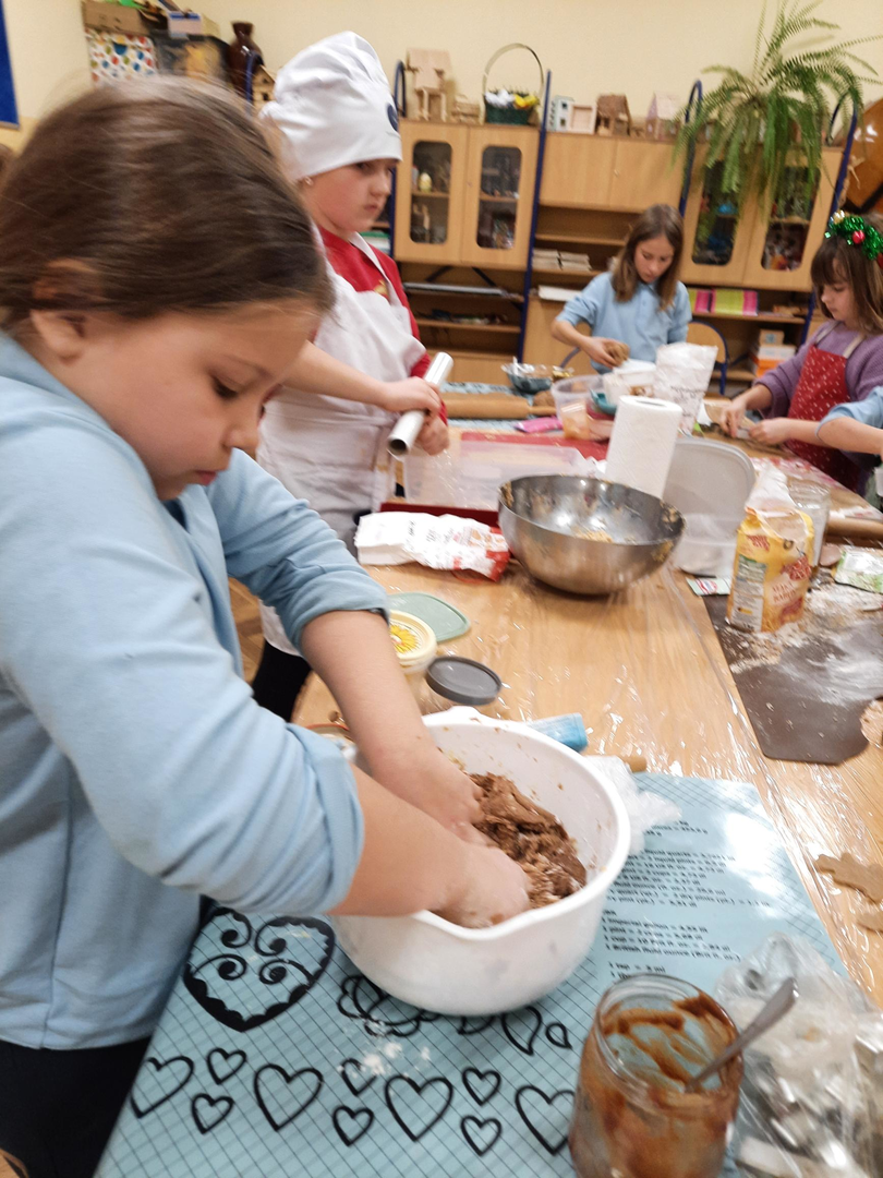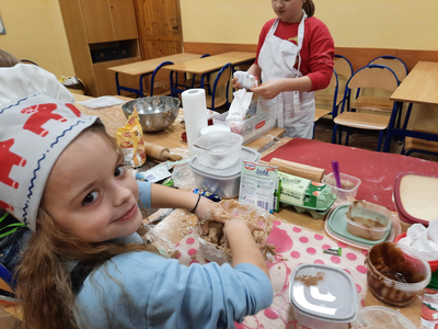 Na zajęciach przygotowali ciasto, z którego wycinali w ulubionych kształtach pierniki. Wypieczone w domu pierniki dzieci dekorowały na kolejnych zajęciach.
