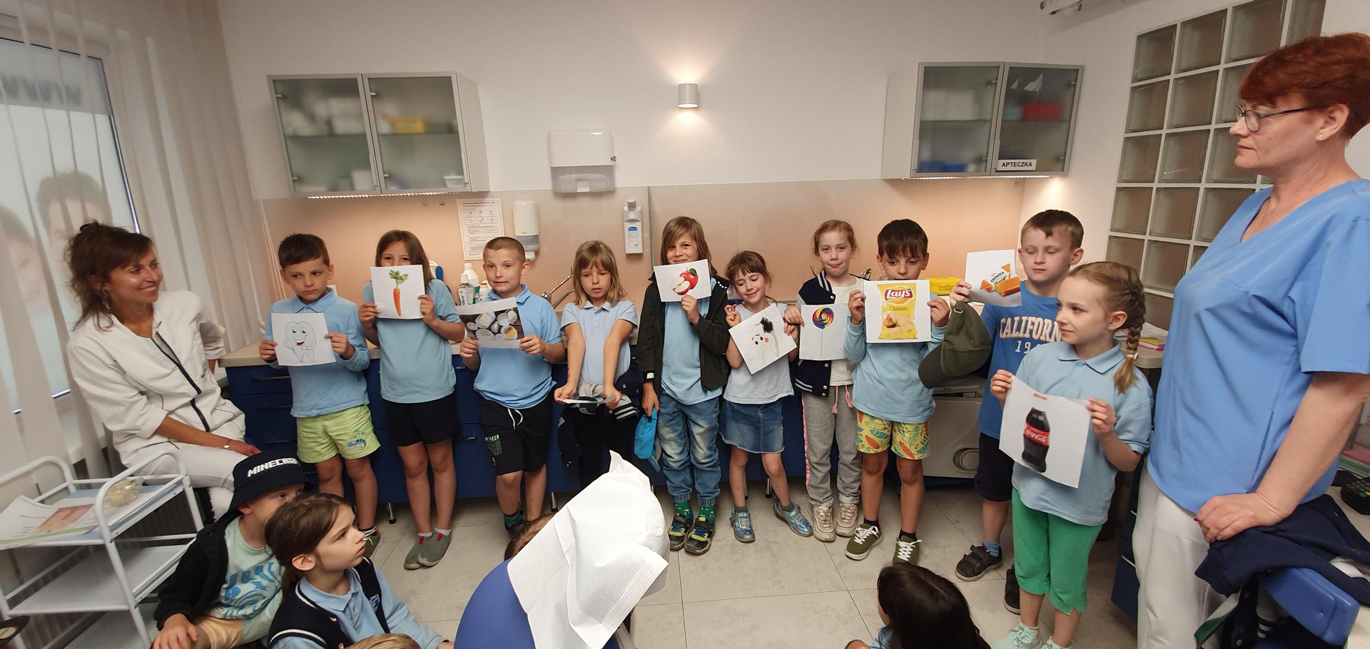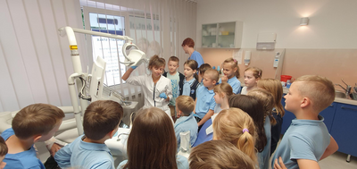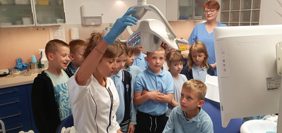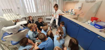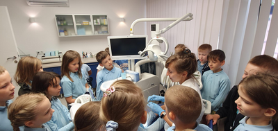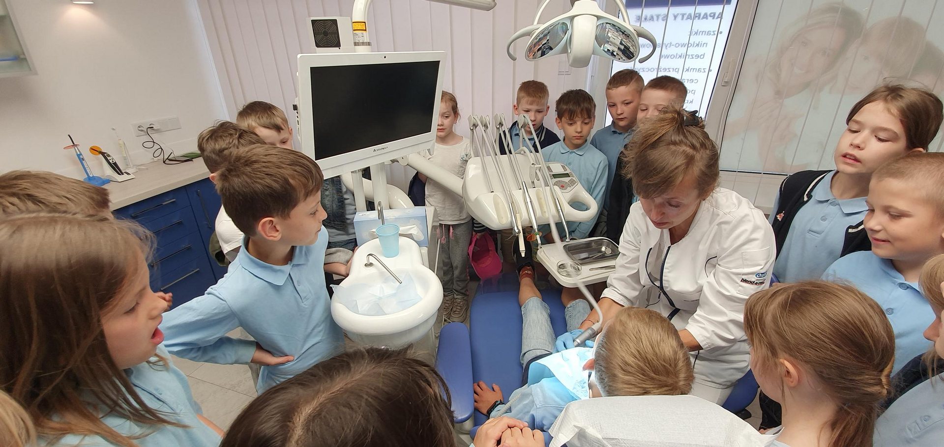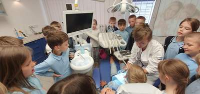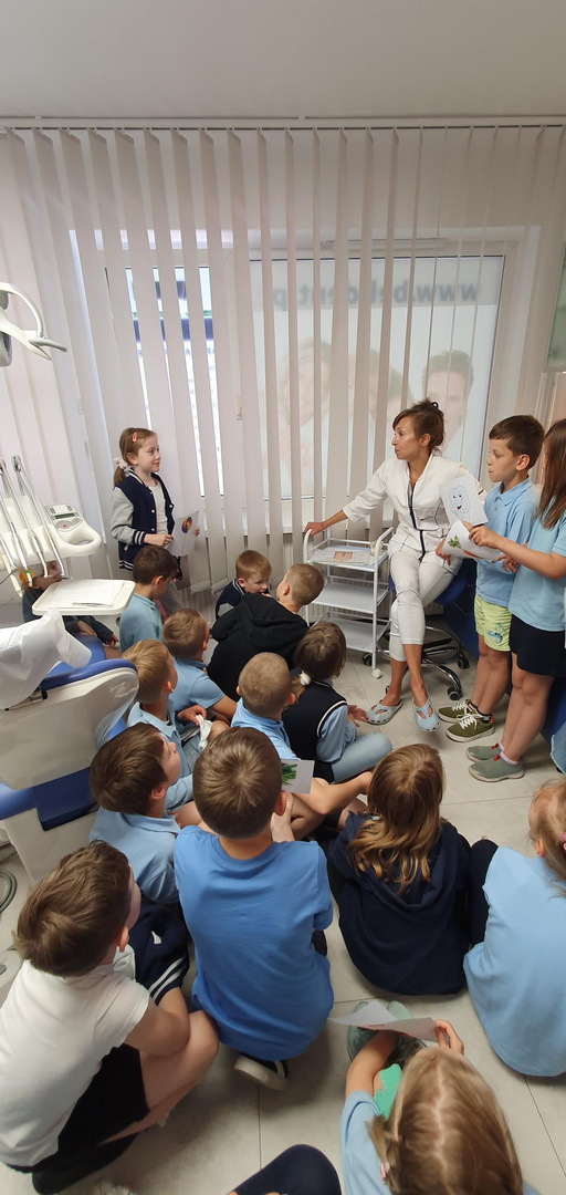 W ramach realizacji projektu „Poznajemy zawody" 6 czerwca wybraliśmy się do pobliskiego gabinetu stomatologicznego w Milanówku, w którym pracuje mama Olka z naszej klasy. Celem wycieczki było poznanie pracy dentysty, ale również uświadomienie dzieciom konieczności dbania o zęby, dbania o higienę jamy ustnej jak również przestrzegania zdrowej diety.