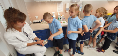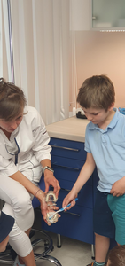 Pani doktor przyjęła nas bardzo serdecznie. Zapoznała dzieci z wyposażeniem gabinetu stomatologicznego, wyjaśniła, jak leczy się zęby oraz pokazała dzieciom działanie sprzętu medycznego. Naszym pacjentem „na niby” był właśnie Olek i muszę to podkreślić: to był bardzo dzielny pacjent. Na zakończenie pani stomatolog przeprowadziła pokaz i pogadankę na temat prawidłowego mycia zębów na zestawie tzw. „dużej szczęki”.