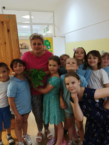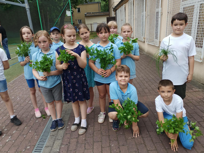 Dziś zebraliśmy plony z naszej grządki z ziołami. Wręczyliśmy je w formie bukietów nauczycielom.