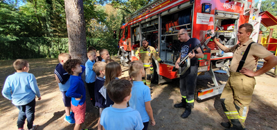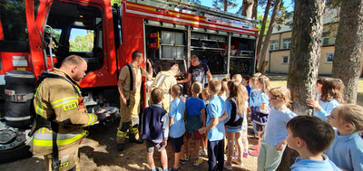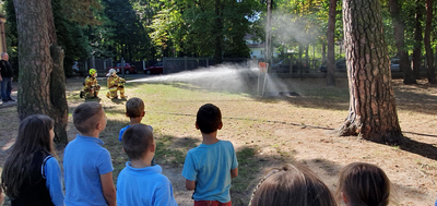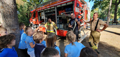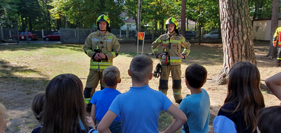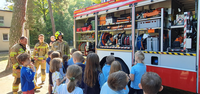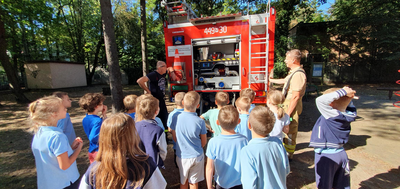 Następnie strażacy przeprowadzili pokaz sprzętu ratowniczo-gaśniczego będącego częścią wyposażenia samochodów pożarniczych. Była też krótka lekcja przypominająca numery alarmowe wraz z instruktażem prawidłowego informowania o zaistniałym zdarzeniu.