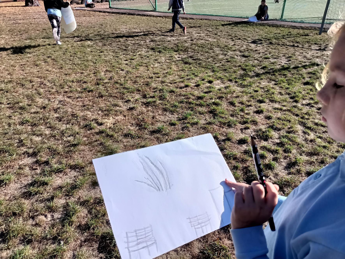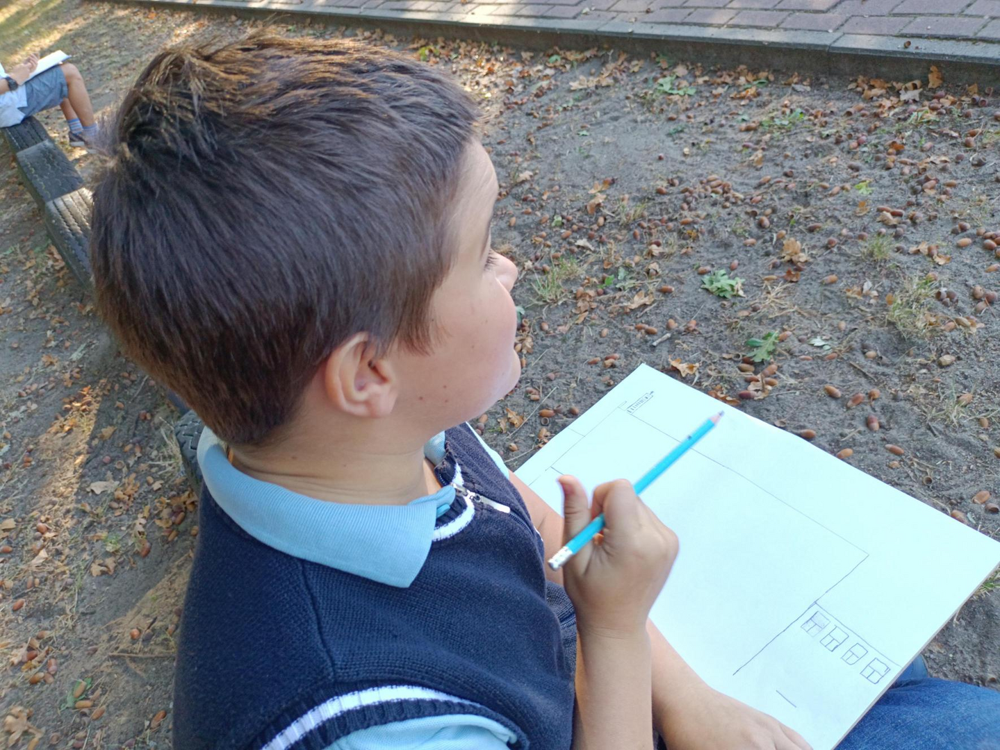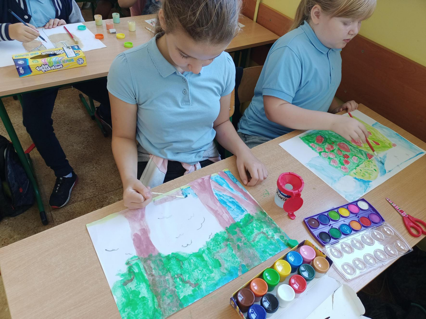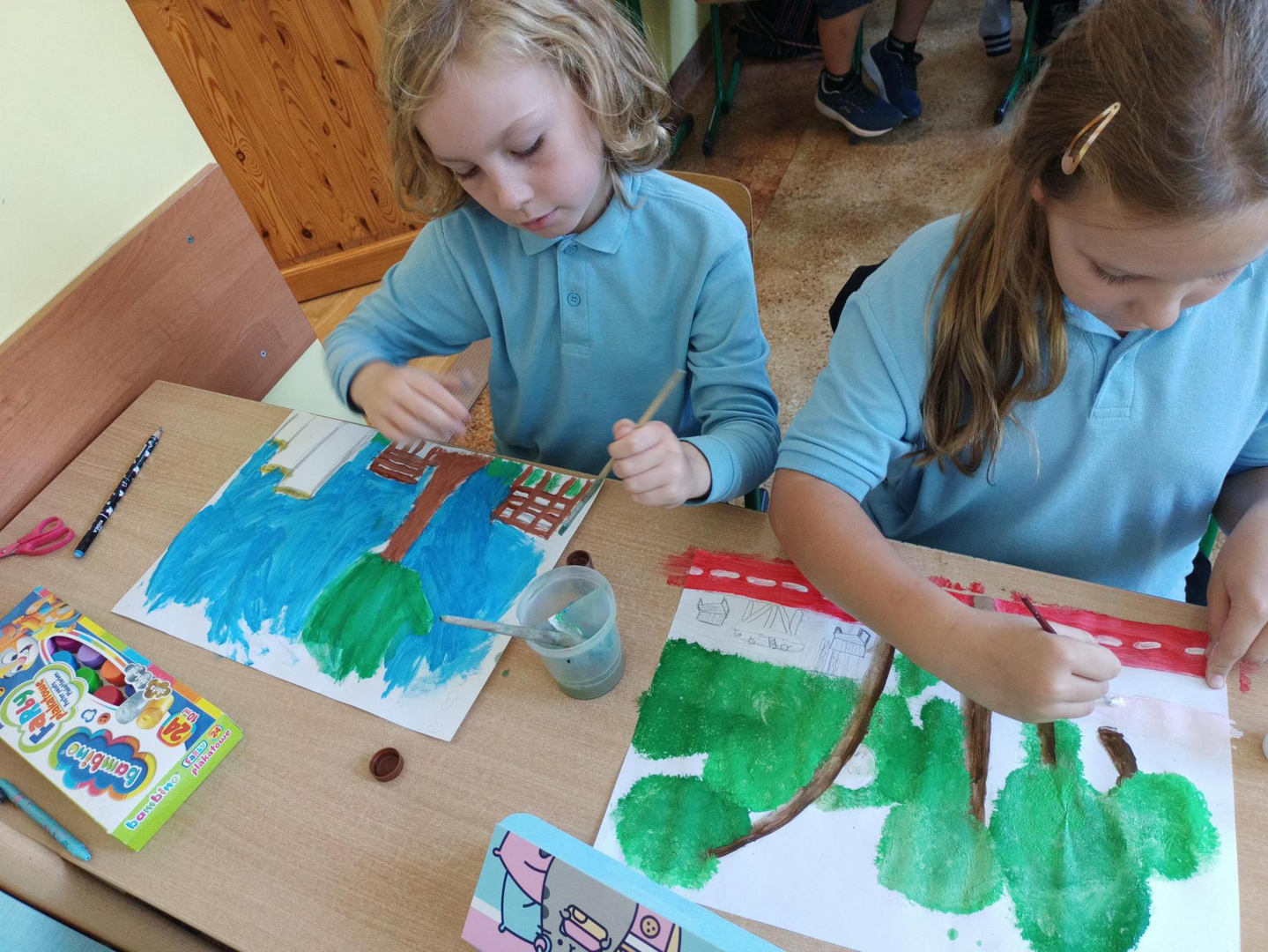 Malarstwo przedstawiające pejzaż boiska szkolnego.