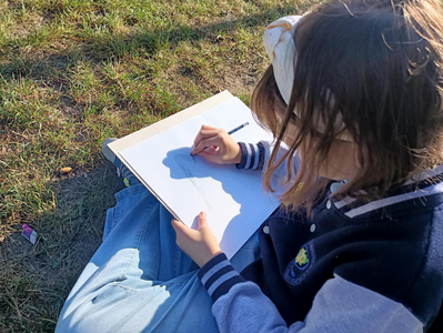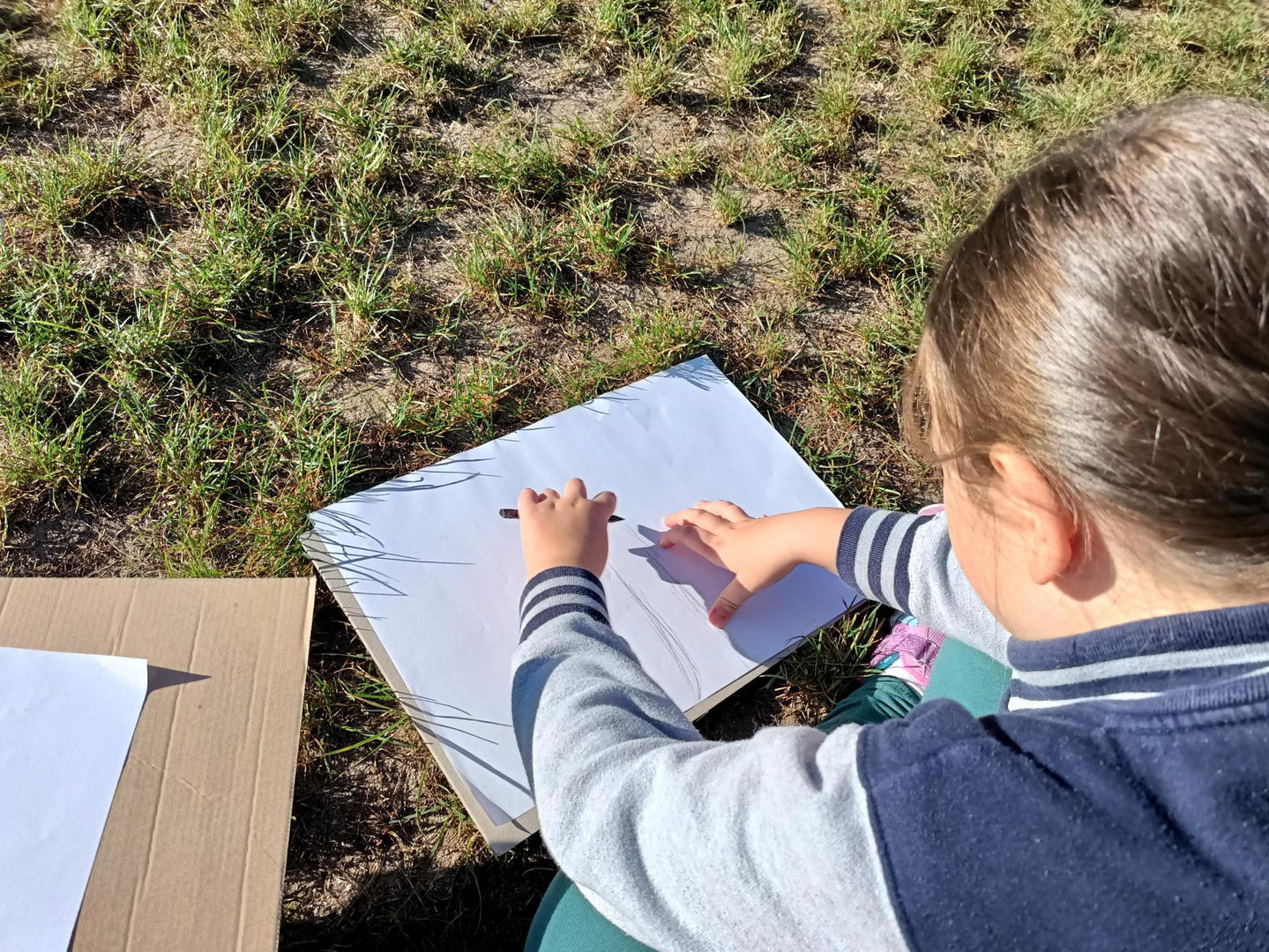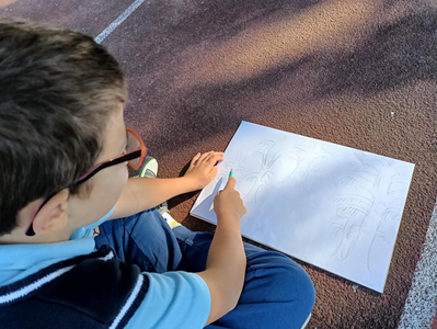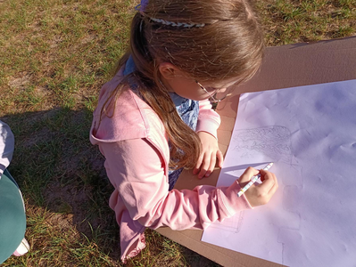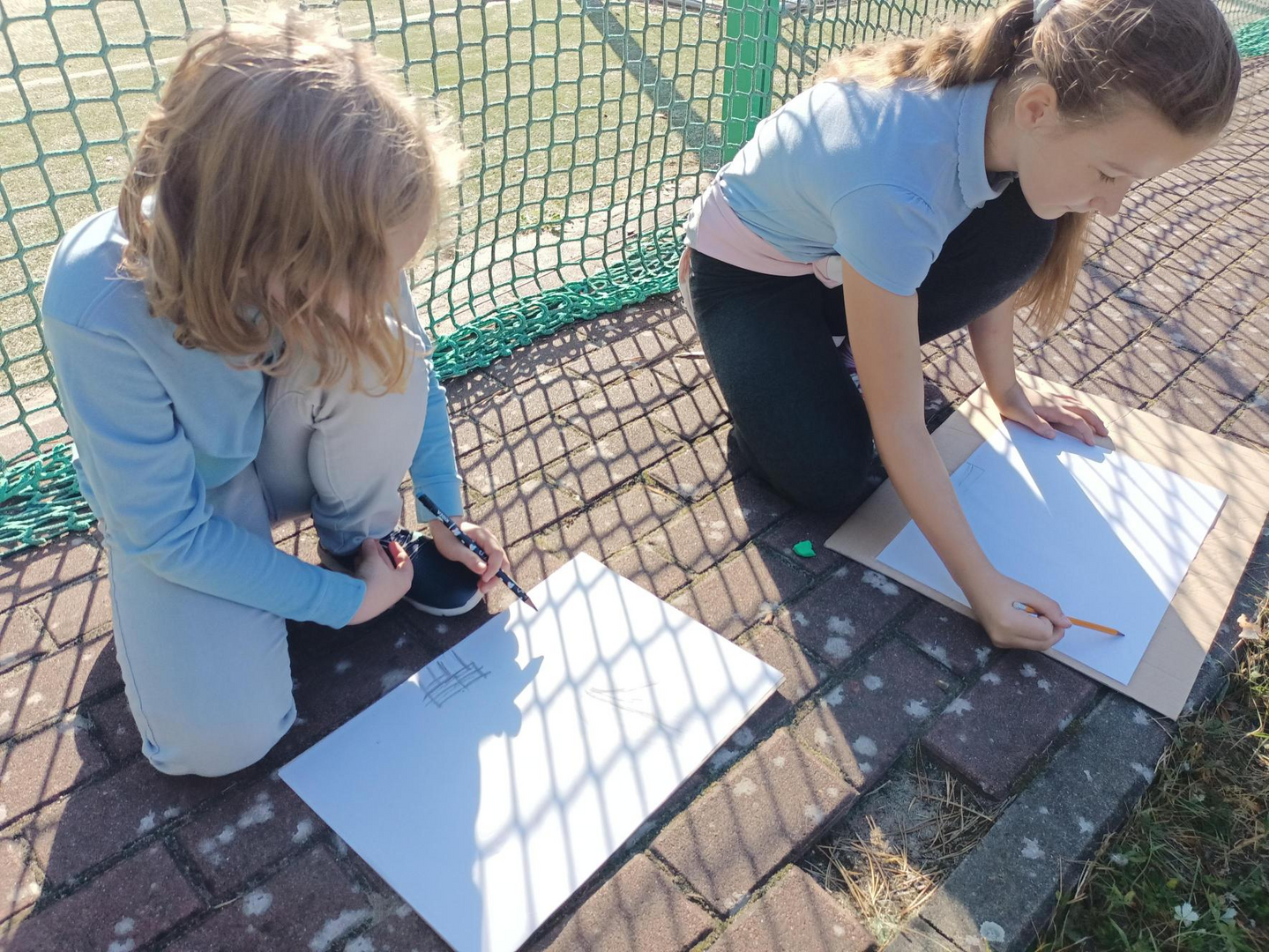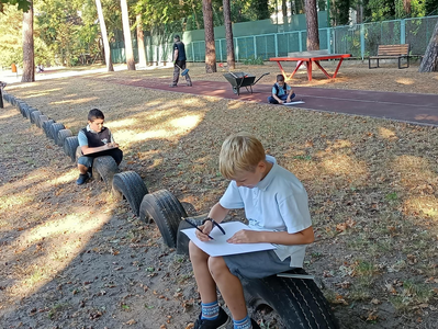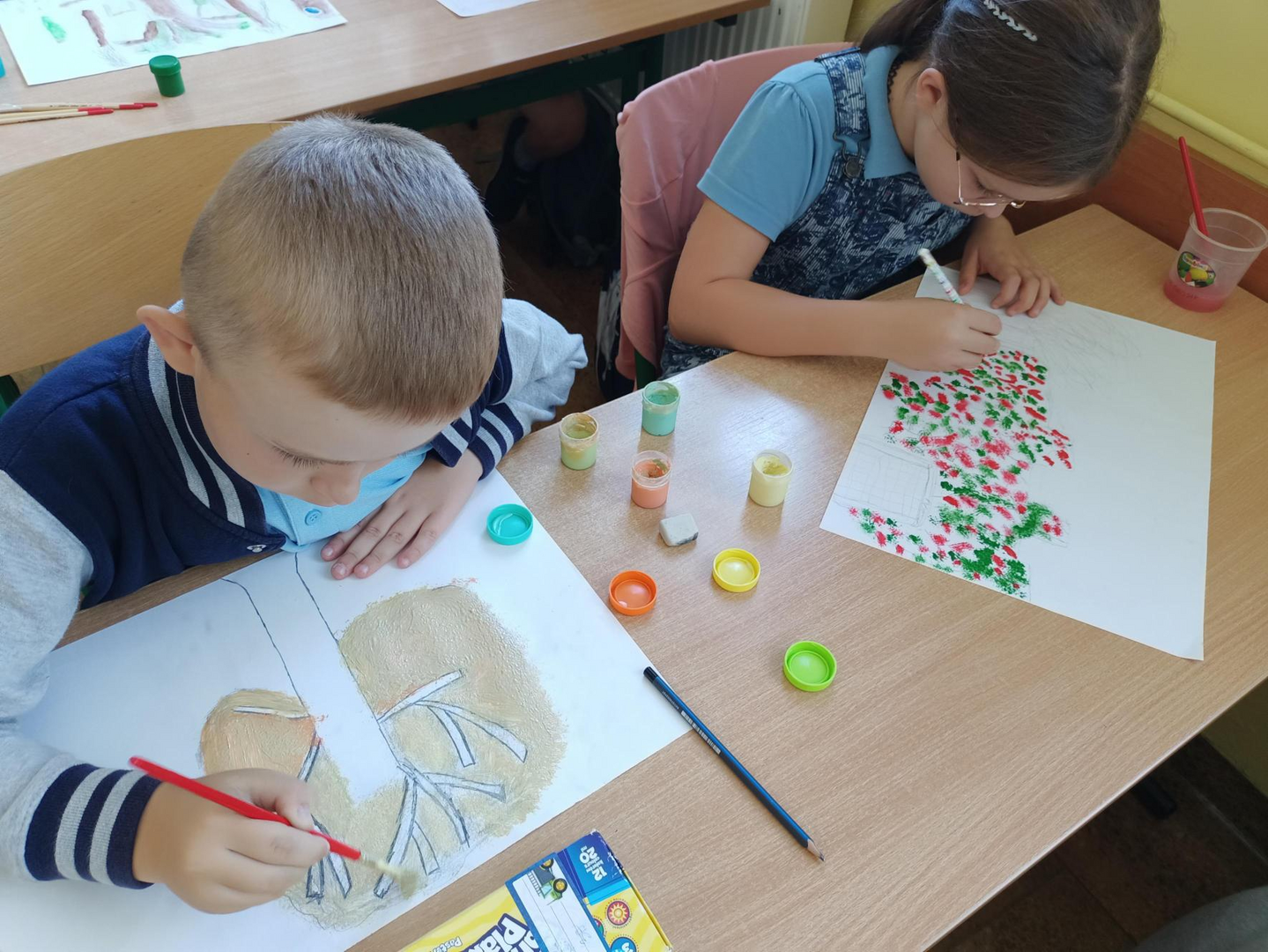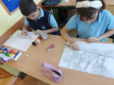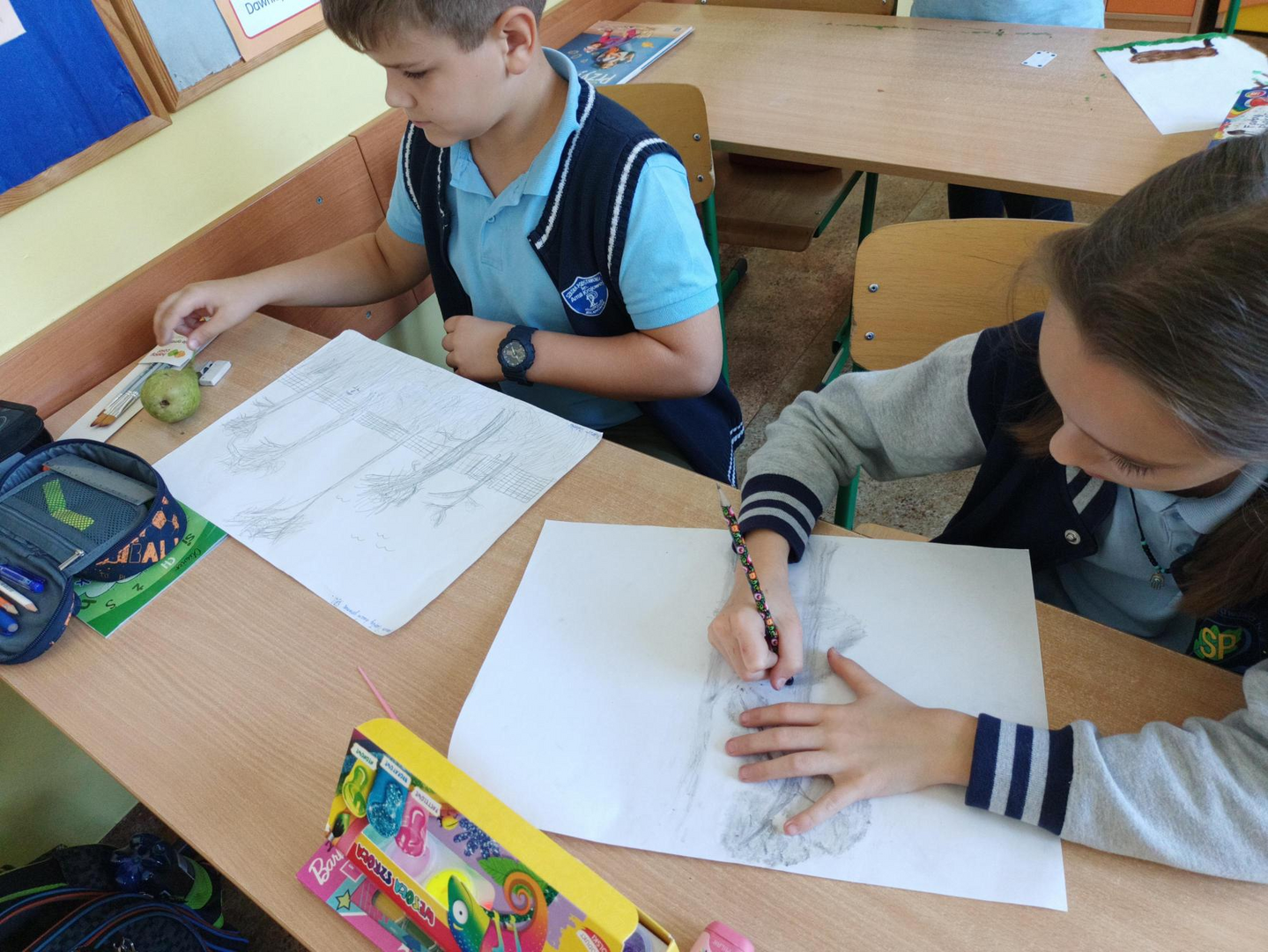 Malarstwo przedstawiające pejzaż boiska szkolnego.