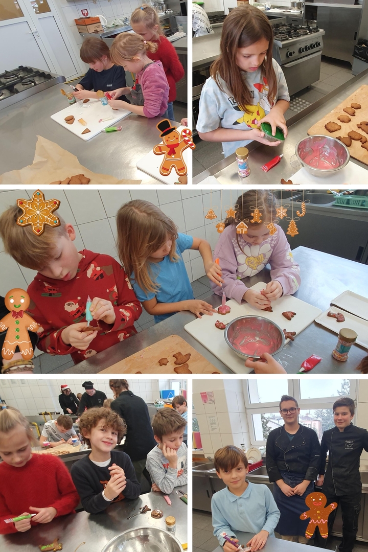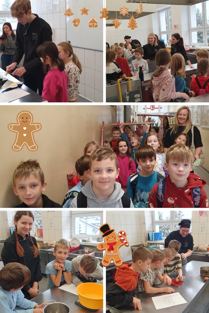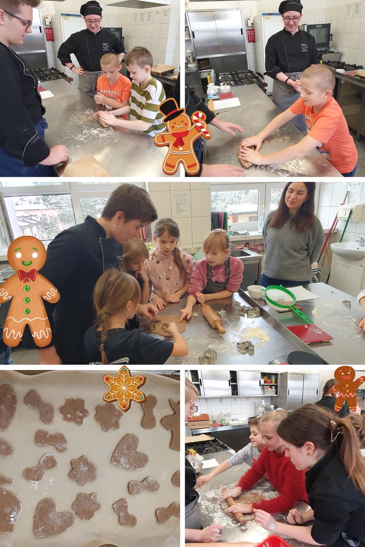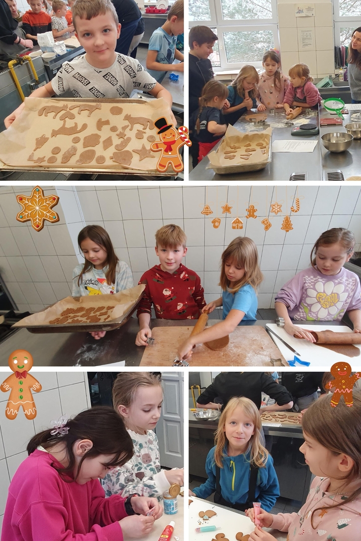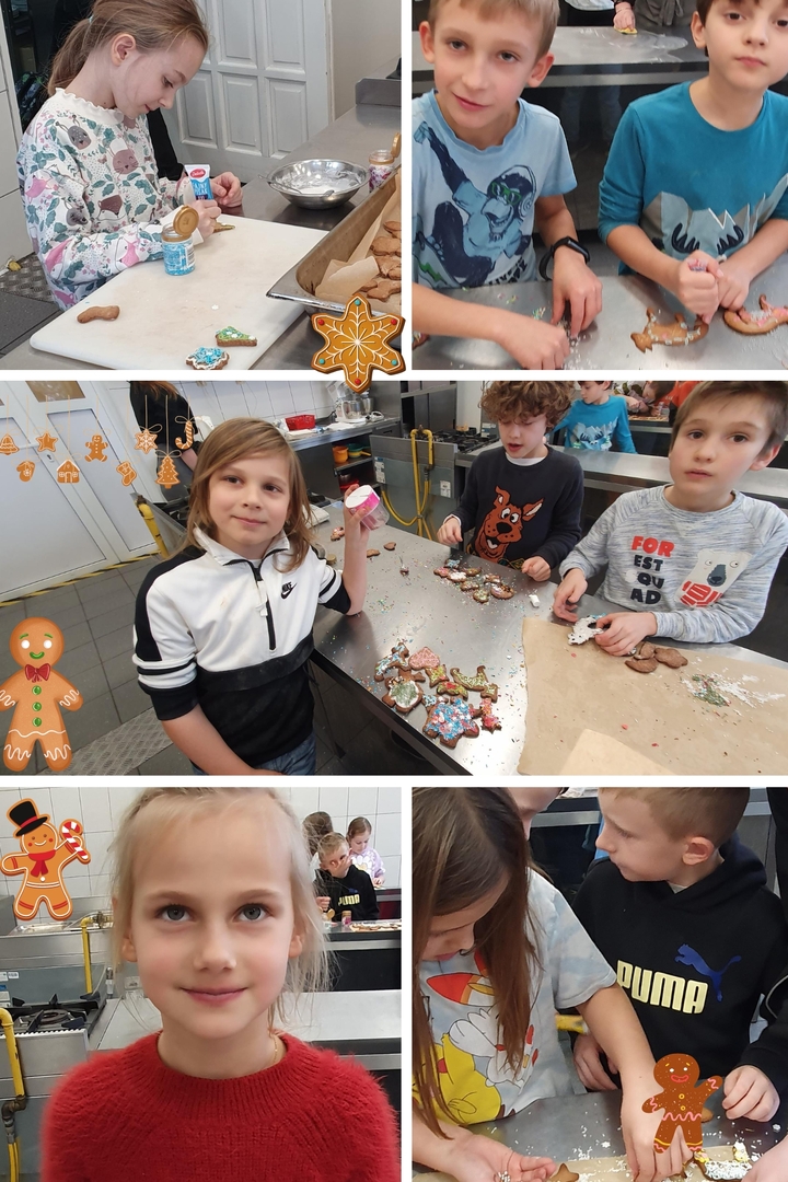 7 grudnia klasa 2a wybrała się na warsztaty kulinarne do Zespołu Szkół nr 1 w Grodzisku Mazowieckim. Głównym zadaniem małych kucharzy było przygotowanie ciasta na pierniki, pieczenie i dekorowanie wykonanych ciasteczek. Uczniowie podzieleni na grupy, wzięli się do pracy. Starsi koledzy i koleżanki przygotowali odpowiednie składniki a dzieci pod ich kierunkiem je ważyły, dodawały i mieszały. Następnie wałkowały ciasto i wycinały różnorodne kształty. Tak przygotowane pierniczki, zostały włożone do pieca. Po upieczeniu przyszedł czas na lukrowanie i ozdabianie według własnej inwencji twórczej.