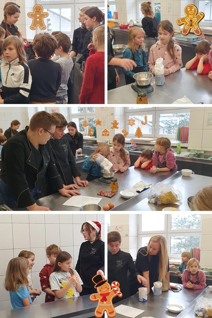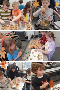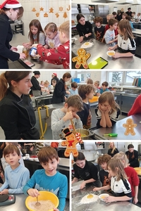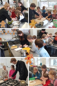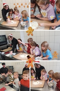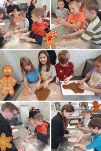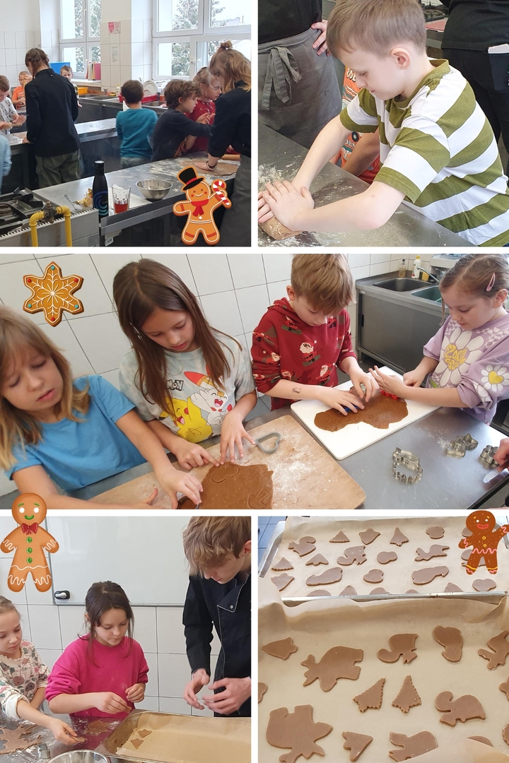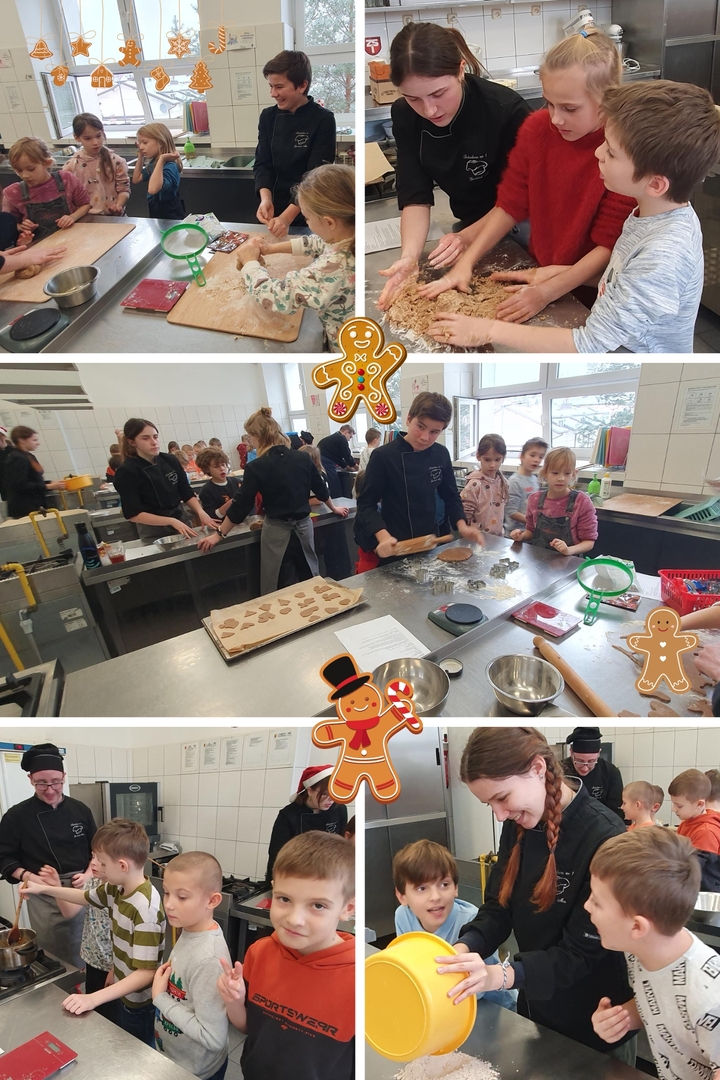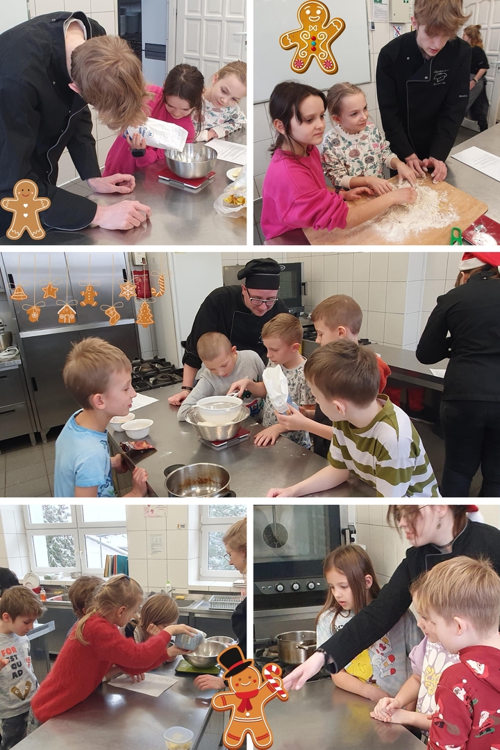 7 grudnia klasa 2a wybrała się na warsztaty kulinarne do Zespołu Szkół nr 1 w Grodzisku Mazowieckim. Głównym zadaniem małych kucharzy było przygotowanie ciasta na pierniki, pieczenie i dekorowanie wykonanych ciasteczek. Uczniowie podzieleni na grupy, wzięli się do pracy. Starsi koledzy i koleżanki przygotowali odpowiednie składniki a dzieci pod ich kierunkiem je ważyły, dodawały i mieszały. Następnie wałkowały ciasto i wycinały różnorodne kształty. Tak przygotowane pierniczki, zostały włożone do pieca. Po upieczeniu przyszedł czas na lukrowanie i ozdabianie według własnej inwencji twórczej.