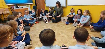 W trakcie ostatniej lekcji klasę 2a odwiedziła pani Małgorzata Zadroga - mama Marty - która jest dietetykiem. Po krótkim wprowadzeniu na temat swojej pracy, pani dietetyk przeprowadziła ciekawą pogadankę na temat zdrowego odżywiania. Podczas zajęć dzieci zdobyły także wiedzę o układzie pokarmowym człowieka. Dowiedziały się z jakich narządów składa się układ trawienny, jakie funkcje pełnią w nim poszczególne organy i jak są zbudowane. Za pomocą kolorowych i milusich rekwizytów przedstawiających m.in.: przełyk, żołądek, jelito cienkie i grube mogły zaobserwować drogę, jaką pokonuje w naszym ciele pożywienie, od pierwszych kęsów do momentu usunięcia z organizmu pozostałości spożywanych przez nas posiłków. Dzieci poznały wiele ciekawostek dotyczących każdej części ciała biorącej udział w procesie trawienia. To była duża porcja naukowej wiedzy, podanej w przystępny, zajmujący i zabawny sposób.