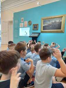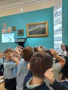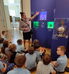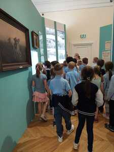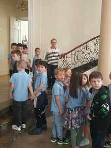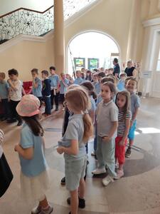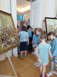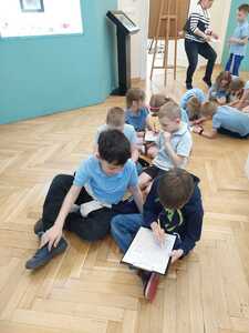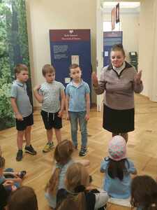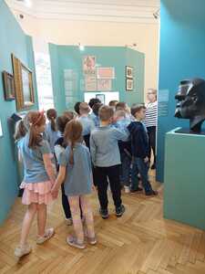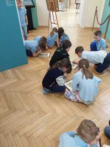 Natomiast klasa 1b wraz ze swoją panią przewodnik ruszyła śladami "Patriotycznego zwierzyńca". Podczas tej lekcji mogły porównać jakie zwierzęta towarzyszą ludziom dziś, a jakie towarzyszyły kiedyś. Konie, kury, psy a nawet niedźwiedź niczym tajemniczy aktorzy przewijali się w opowieściach pracownika muzeum.