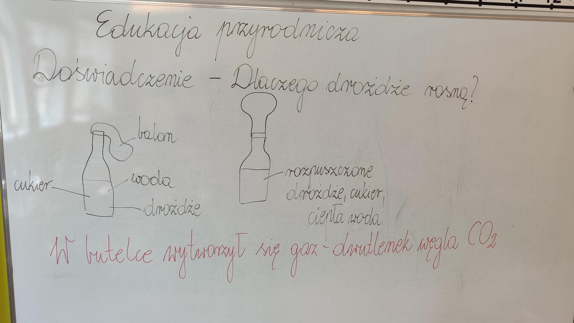 Realizując temat - "Dlaczego drożdże rosną?" uczniowie klasy 1a poprzez doświadczenie z drożdżami, ciepłą wodą, cukrem oraz butelką i balonem, na własne oczy zobaczyli jak rosną drożdże.