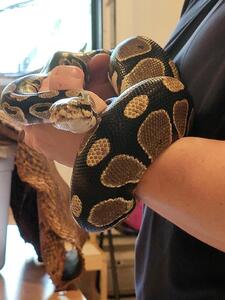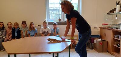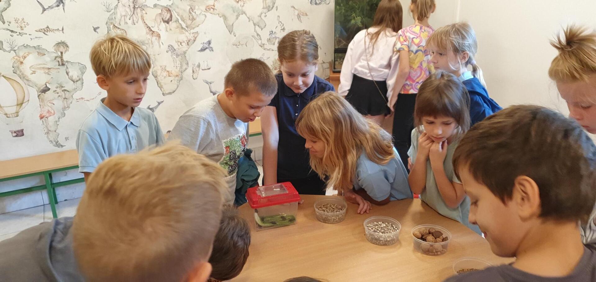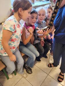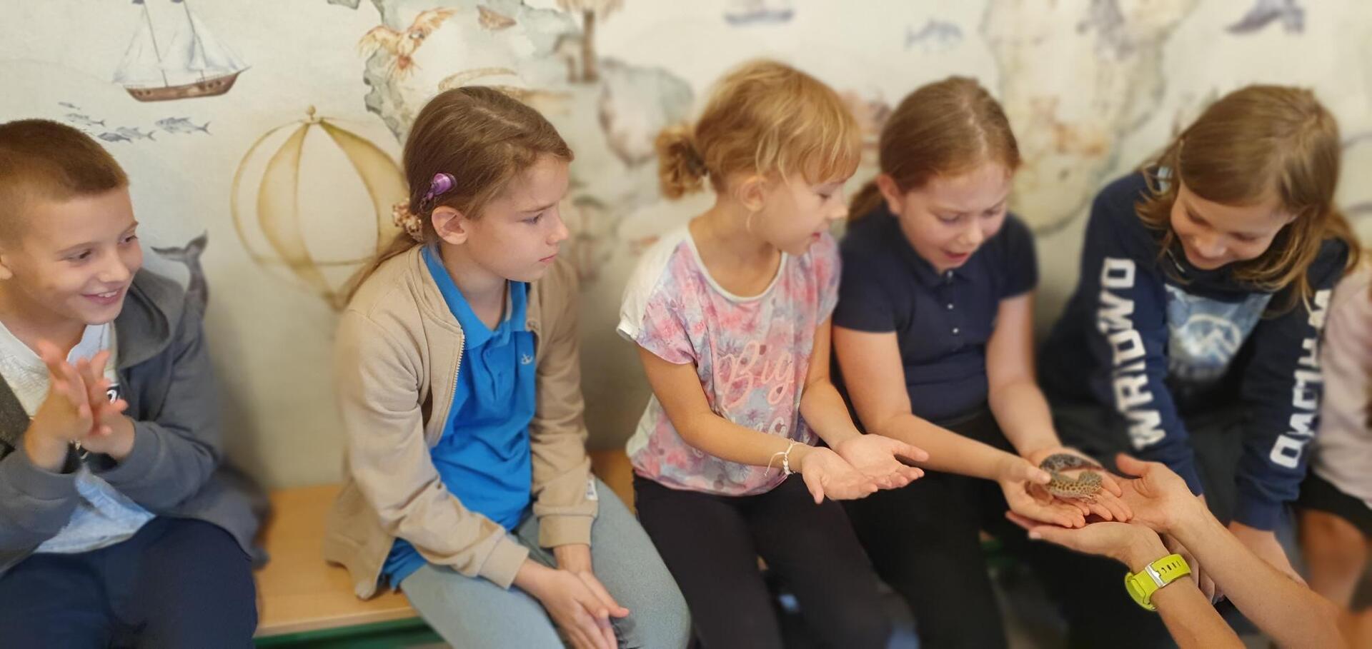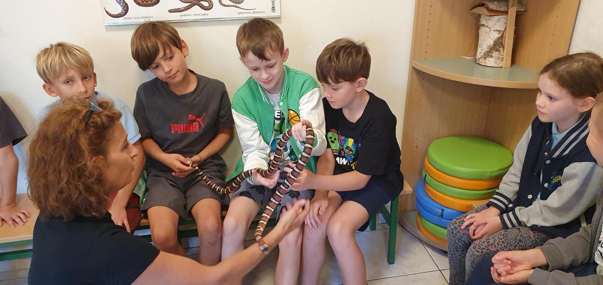 Trzecioklasiści uczestniczyli również w lekcji pokazowo - warsztatowej. Zapoznali się z podstawowymi zasadami hodowli zwierząt egzotycznych w domu. Po części warsztatowej nastąpiła prezentacja zwierząt. Chętni mieli możliwość bezpośredniego kontaktu z oswojonymi gadami i bezkręgowcami.
