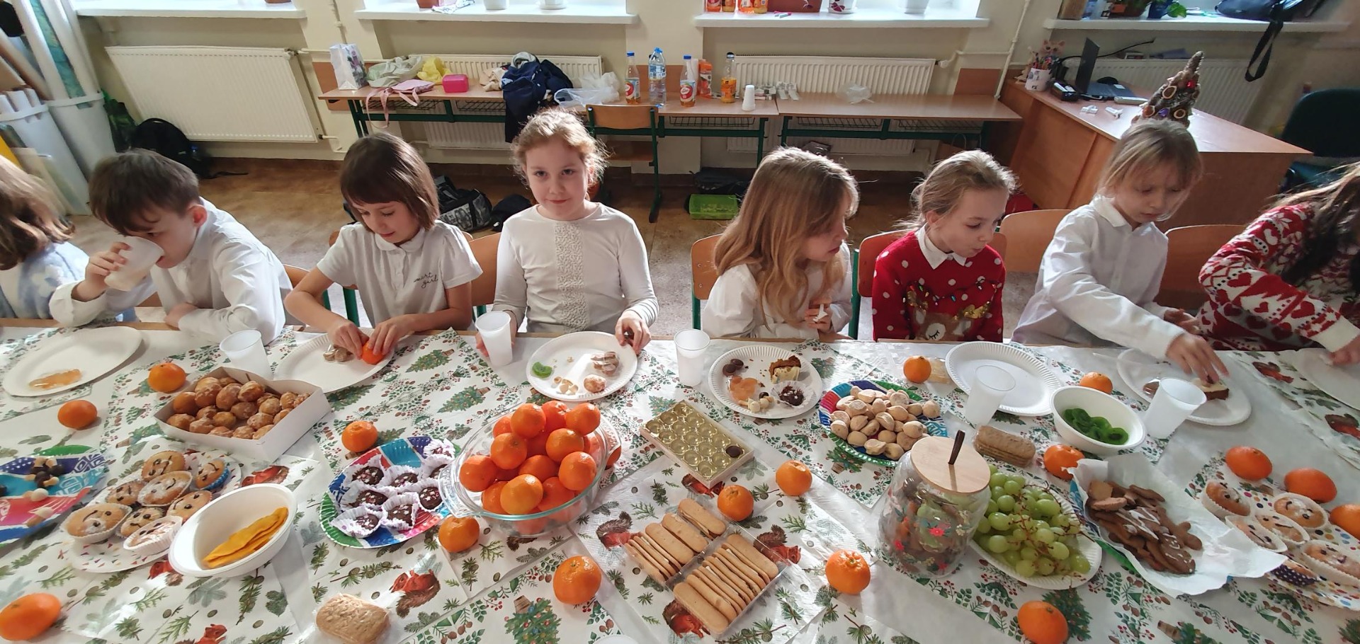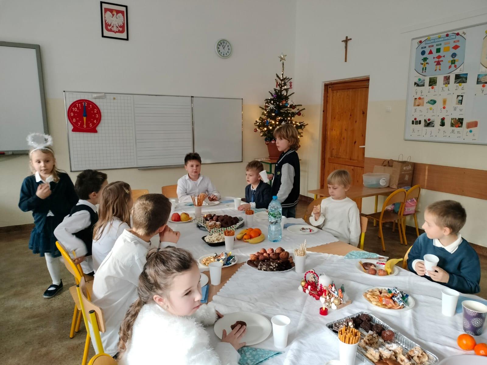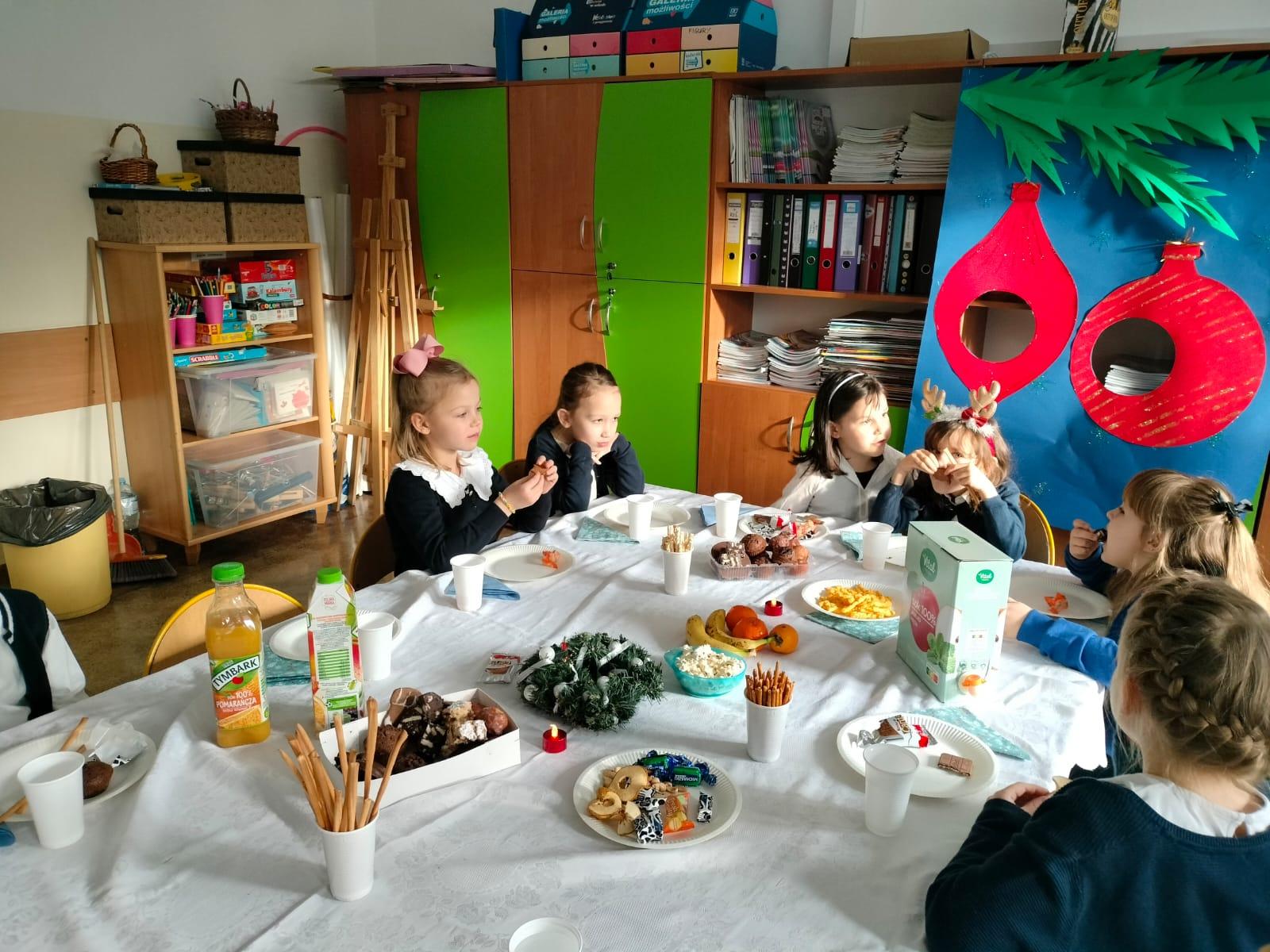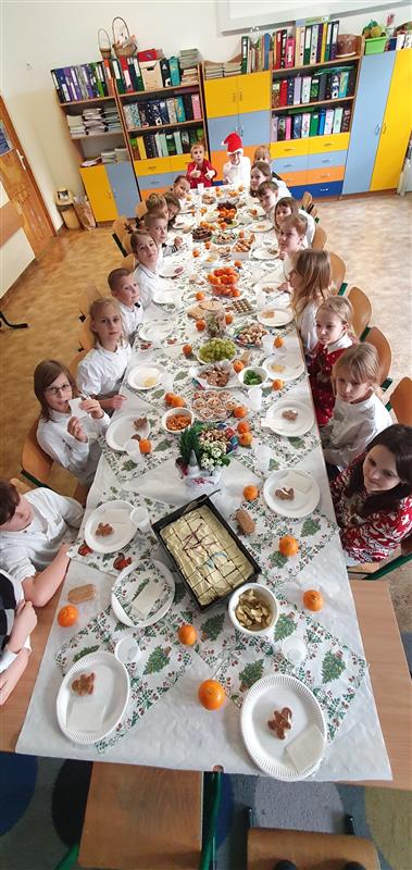 Pięknie udekorowane sale, elegancki strój, ławki nakryte białym obrusem, opłatek na stole oraz życzliwa atmosfera stworzyły niepowtarzalny klimat. Podczas tych spotkań nie mogło zabraknąć świątecznych życzeń, rozmów, wspólnego kolędowania, a także słodkiego poczęstunku. Był też Mikołaj z prezentami. Radości nie było końca.