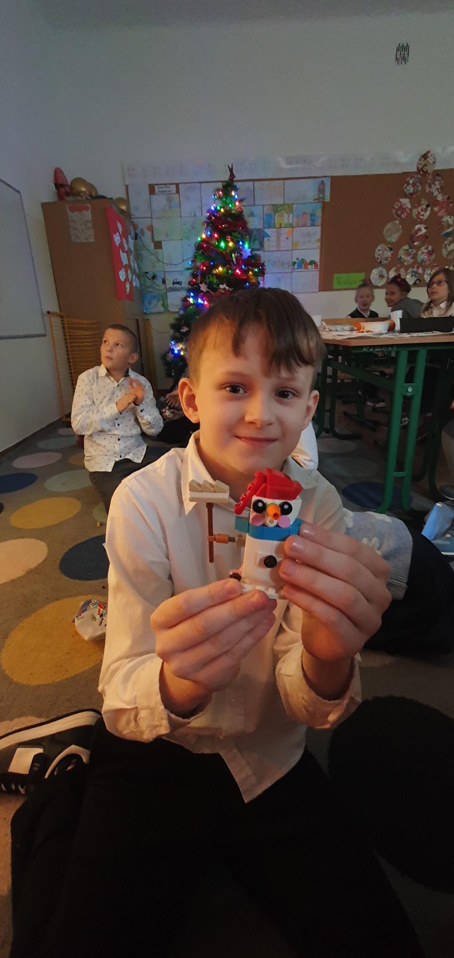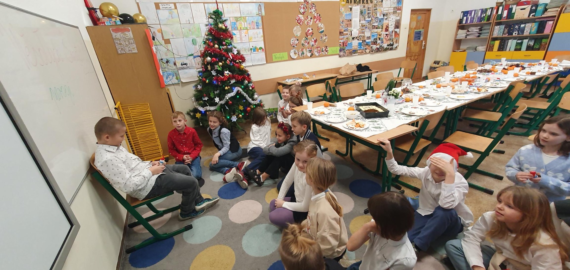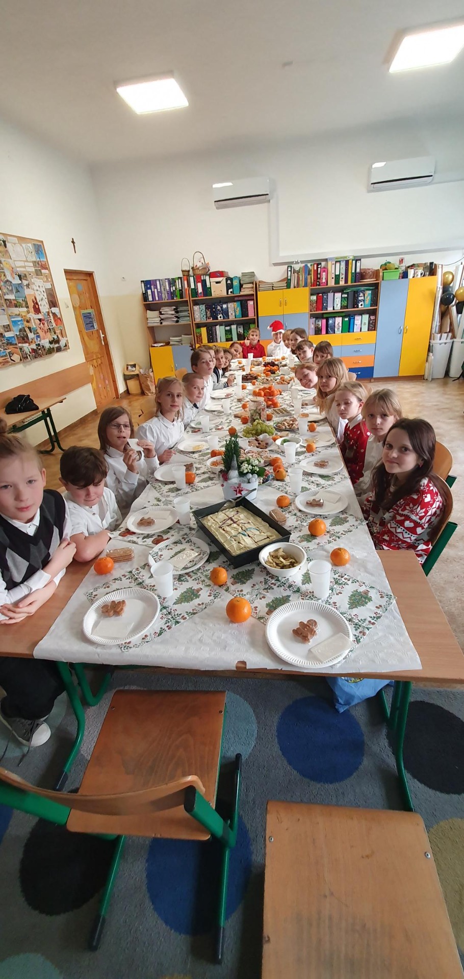 Pięknie udekorowane sale, elegancki strój, ławki nakryte białym obrusem, opłatek na stole oraz życzliwa atmosfera stworzyły niepowtarzalny klimat. Podczas tych spotkań nie mogło zabraknąć świątecznych życzeń, rozmów, wspólnego kolędowania, a także słodkiego poczęstunku. Był też Mikołaj z prezentami. Radości nie było końca.