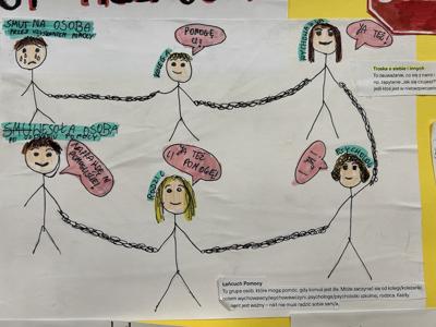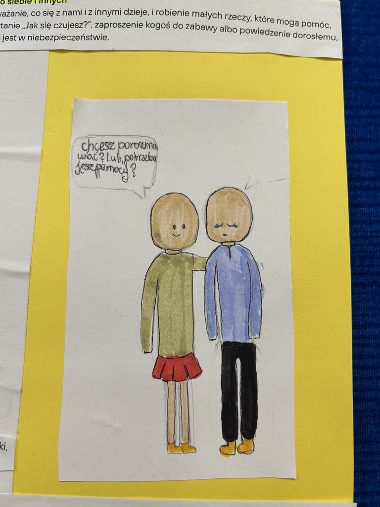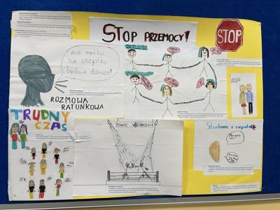 Klasy czwarte realizowały scenariusz pt. „Bądź kumplem, nie dokuczaj” przygotowany przez Fundację Dajemy Dzieciom Siłę. Dzieci zastanawiały się, kim jest dokuczacz, jakie zachowania można uznać za dokuczanie oraz z czego mogą wynikać takie postawy. Wspólnie poszukiwały sposobów przeciwdziałania przemocy i wspierania osób doświadczających trudnych sytuacji. Ich starsi koledzy analizowali zjawisko przemocy- definiowali je i próbowali stworzyć receptę na to, jak sobie radzić z różnymi typami agresji. Uczniowie uświadomili sobie, jak krzywdzące mogą być wypowiadane słowa. Dyskutowali też na temat mechanizmów psychologicznych leżących u podstaw przemocy i skutków przemocy wśród rówieśników. Uczniowie dowiedzieli się, jak udzielać podstawowego wsparcia emocjonalnego rówieśnikowi w kryzysie oraz jak bezpiecznie przekierować go do osoby dorosłej, która może udzielić fachowej pomocy. Podczas zajęć powstały plakaty promujące postawy życzliwości i wzajemnego szacunku oraz sposoby reagowania i poszukiwania pomocy w trudnych sytuacjach.